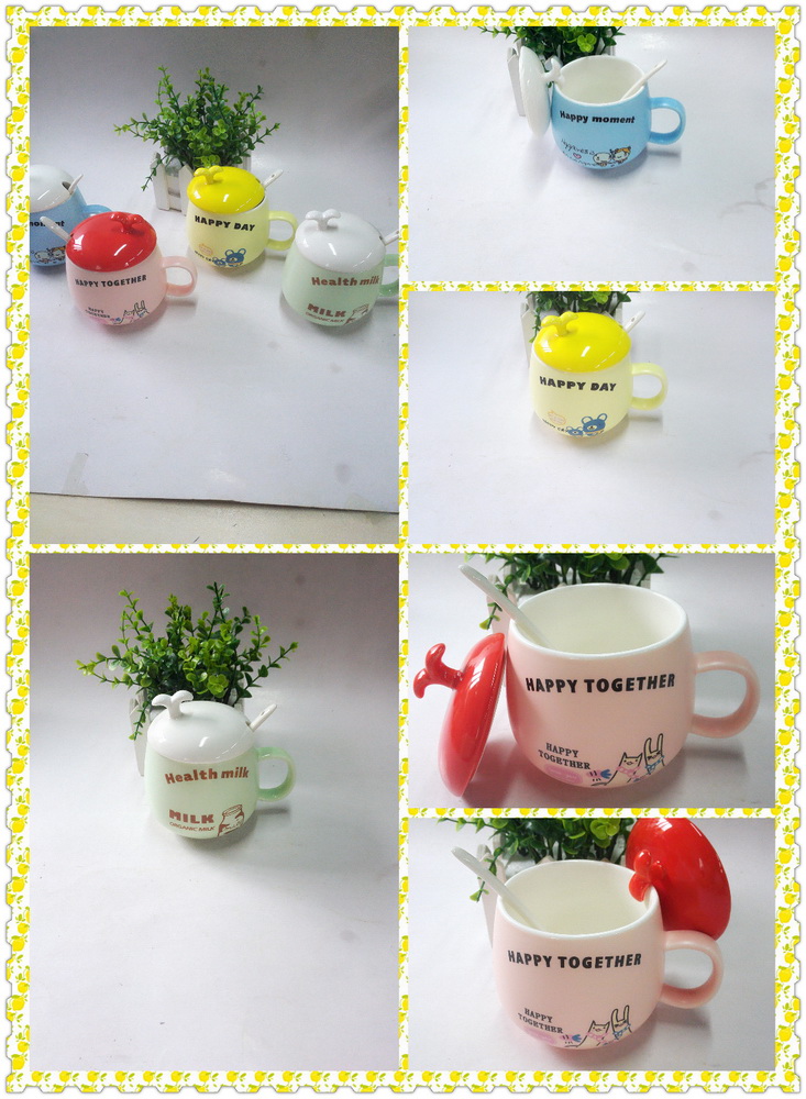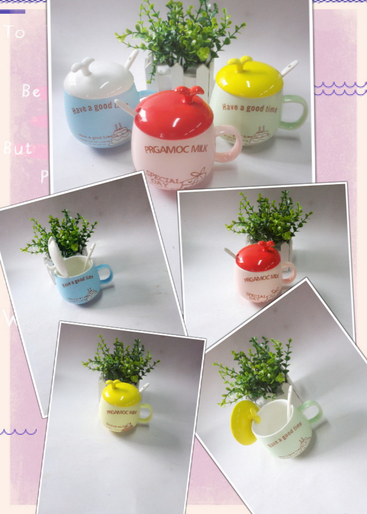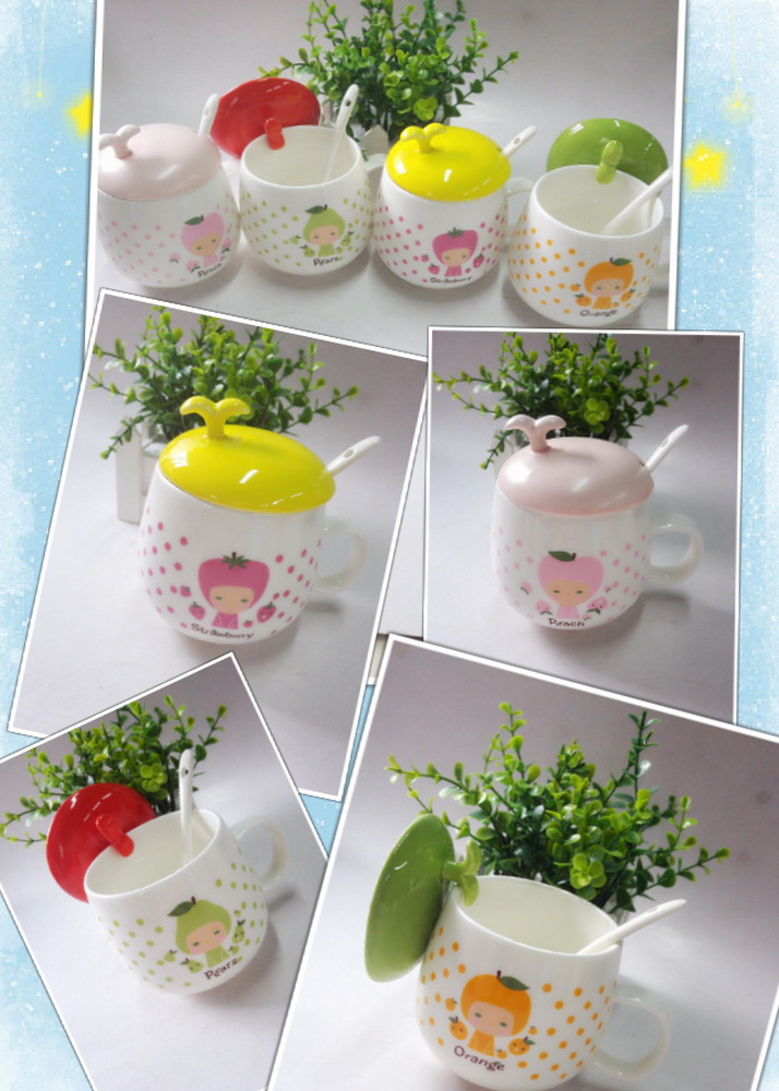 with an apple mug cover and a ceramic spoon