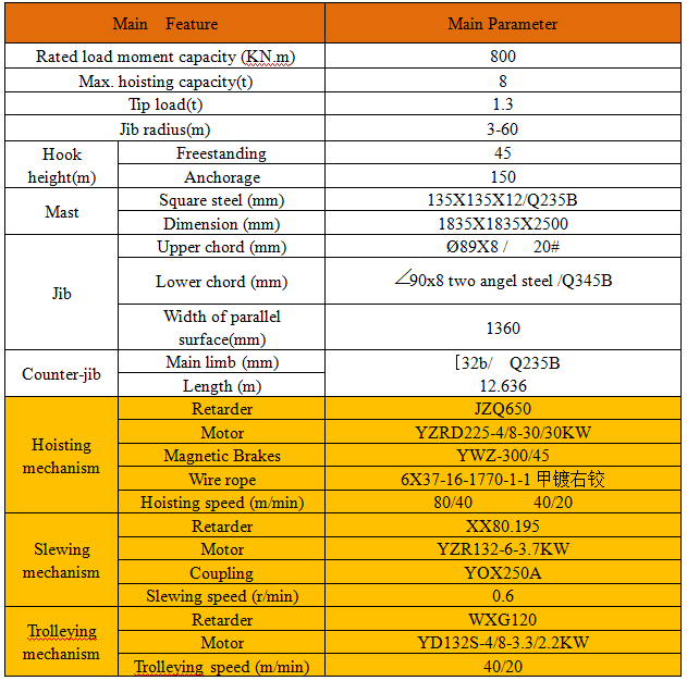 The hoisting mechanism is an AC variable-frequency mechanism, realizing complete stepless speed regulation and fully utilizing motor drive property, featured with wide speed-regulating range and high working efficiency. The mechanical transmission applies mature domestic technique, in which the spur gear or bevel gear work reliably, the rope drum adopts a special Z-shaped grooving technique. The mechanism is equipped with complete and reliable security protection, brake logic control system, capable of realizing “suspension” in the air, and overspeed with light load and largely improving efficiency of tower crane.
