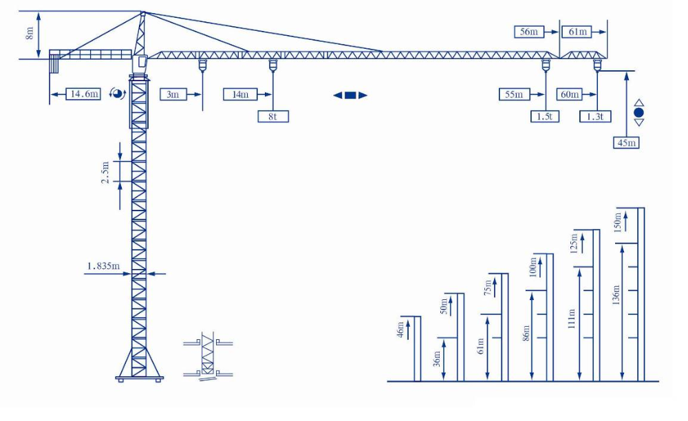 2) QTZ50P-4810 topless tower crane is the smallest flattop tower crane that we can produce, easy installing and dismantling mast section use angle steel ∠160*160*14, size of mast is 1.6*1.6*2.5m.