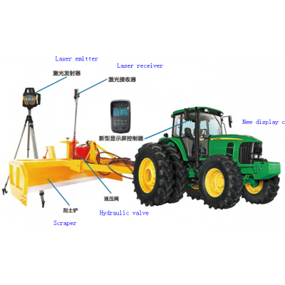 The working principle is as follows: the laser emitter emits a reference circular plane of a certain diameter (the reference slope can also be provided). The receiver mounted on the blade support rod controls the hydraulic actuator by processing the collected signal through the controller. The hydraulic mechanism can control the up and down movement of the scraper shovel as required , and the land leveling operation can be completed.