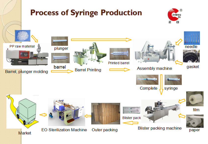This syringe making machine including, Injection Moulding machine, Mould, Syringe Barrel Printing Machine, Syringe Assembly Machine, needle assembly machine, Syringe Packing Machine and Ethylene Oxide Sterilization Machine. We will help you design the exact machine for your after get your detail equirement. Like the syringe type, the packing method, the production capacity. We also can help customers draw the workshop layout once known the detail size of the factory.