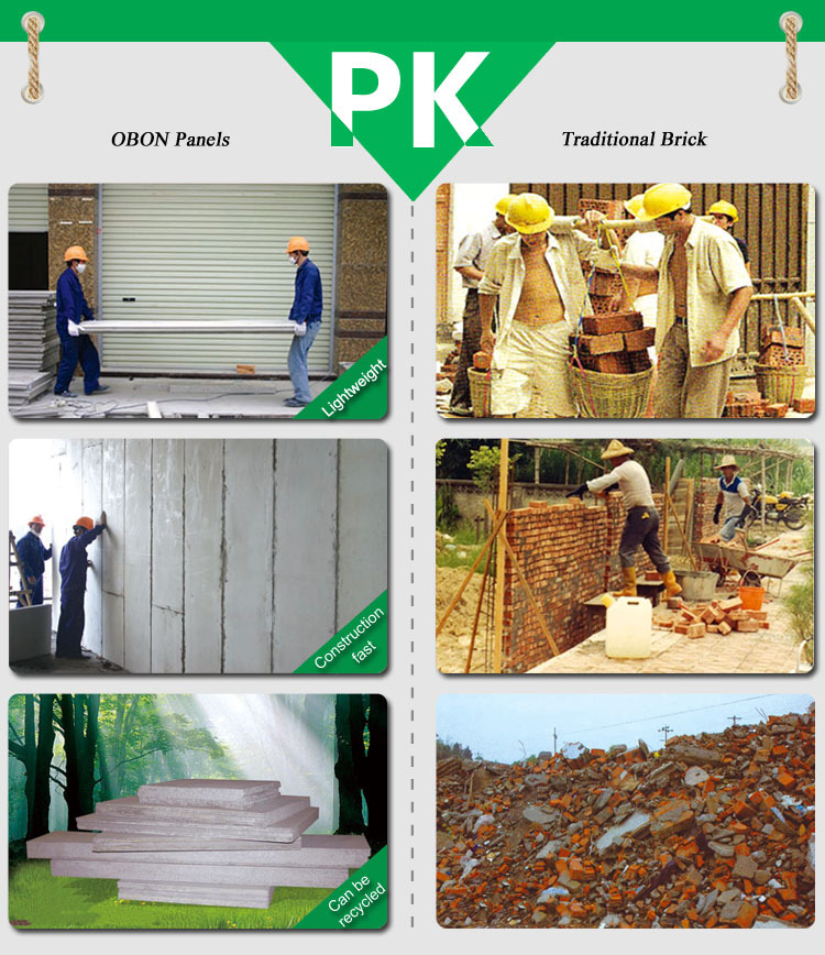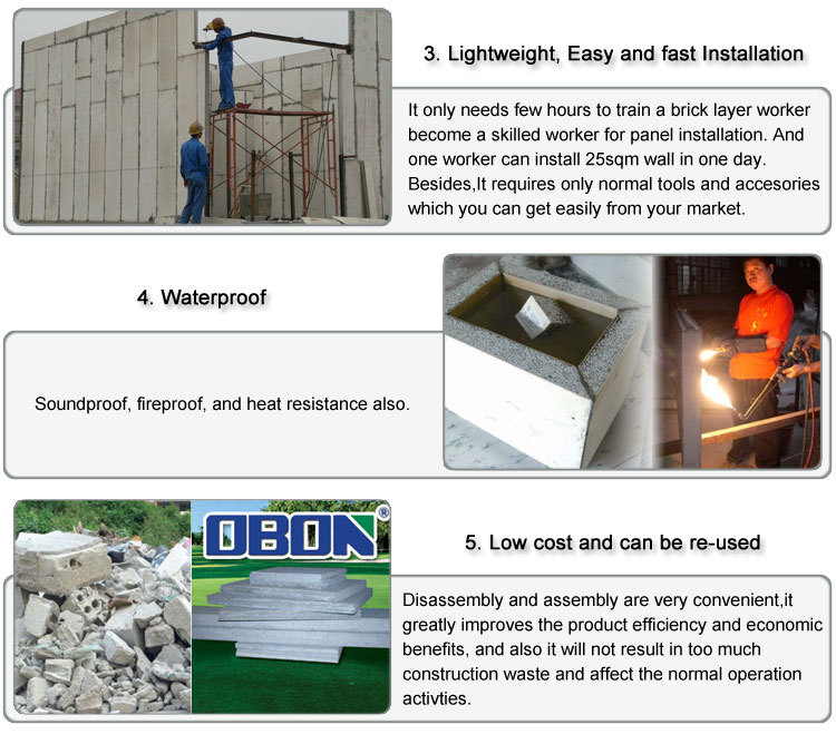 OBON EPS (Expanded polystyrene board) wall Panel is composed of exterior panels and interior core filling, to form a non-load-bearing light-weight composite wall panel. The exterior panels on both sides are 5mm calcium silicate board, and the middle core is filled with polystyrene beads & cement or ceramsite, polystyrene beads & cement.