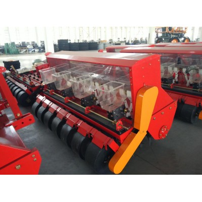 FEATUREThis kind of seeder is a multifunction seeder, suitable for drilling wheat, corn, sorghum, soybean, sesame and other crops, combine the function of leveling. furrowing , sowing, fertilizing, covering at the same time. This wheat planter can be hitched to a tractor of 66-75hp . it drills seeds and fertilizer together but delivers them separately in s single drive. Seeds and fertilizer are drilled at different depths thus improves germination. Wheat planter uses press wheel, driven by the chain in drive part and also has the feature of seeding uniformity ,high working efficiency .saving seeds, and the depth of seeding can be regulated and controlled, the row spacing is stable.PARAMETER