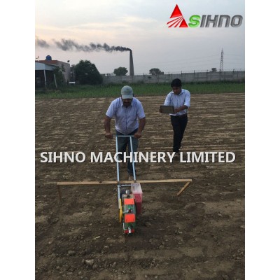 According to the size of the seed roller, it can plant corn, peanut,soybean, pea nut, mung bean,walnut,sorghum,tea.Operation:Users can choose any eight kinds of spacing around the rims have curved plates connected to form a funnel.Each arc nozzle plate fixed to a child , the child 's length by Tsui pitch control seed depth and spacing on the rims fixed multiple funnel , funnel each side of each trimmed with a putter S , S putter push transmission rod , the rod driven wheel drive , wheels and wheel types are the same shaft , so kind of the wheels turning a spacing perspective , spit the seeds into the funne .And the active sub- nozzle axis of rotation in a small center of the weld , the three sub- bearing activities Tsui accurate opening and closing action , the seeds fall into the soil, in order to achieve accurate seeding purposes. Push the sides of the shaft with a flat center bushings and brackets and stiffeners connected together adjust ( the M6 rod nut fixed ) , in human driven seeder rolling forward, driven by the sprocket to intermittent exercise achieve sowing. The planting is essential to achieve a single grain of corn planting and two tablets , in order to meet the needs of most regional farmers' friend , the factory is equipped with five specifications of seed round. Users can kind of grain size and a choice of 5 colors any seed round , when changing the kinds of wheel covers open wheel , remove the seed round , then you need to kind of push it round his hand , note: For the convenience of users , factory installed in two different types of wheel size ( any unicast - the market leader ) friends who choose the machine you install adjustment finished, before the official sowing seeds into the ground , or ask you now try to push in the furrow in some distance, check the seed is normal, but after sowing . And then be sure to always check the seeding process , identify problems and timely adjustment and treatment, or because of election round , improper adjustment lack seeds, germination failure , the factory is not responsible. Care and Maintenance:1 In the course of the various parts should always check the bolts, self tapping screws are loose,discovered in time to prevent shedding. 2.After sowing, please be seeder apart, clean all parts of the various threads of oiled to prevent rust. Be sure to carefully remember good order, assemble in reverse order when disassembled good debugging, stored in a cool dry place, in order to extend the life time of assembly. Precautions:1.When using with a coating of seeds, fossils must be mixed with 0.5% or 0.2% lead oxide powder coating agents do a good job in the post and then into the seed box .2.Soil wet or rain to pay special attention if a foreign body within the nozzle son.3.Matching species should seriously by seed round .4.Non- running, pull down , push down ( rotation direction of the arrow )5.Seeding rate must be controlled , the proposed 35-40 meters per minute.6.The seeder is strictly prohibited as such as children toys free push and touch the gear to avoid damage and injury.7.Seed grain tank capacity of not less than one third .8.Please strictly running in the direction of the arrow seeder seed box side when in use.9.When they find significantly reduced the use of seed per acre amount , please check for obstructions or other failure , so as not to cause you loss.10.Spare kind of wheels and accessories and then put inside the box .11.Adjust spacing , when removing the assembly must remember good order, carefully aligned prefix fixed good ( 0 want to pay particular attention to the positive sides )12.All dimensions are factory supplied with the seeding rate , please prevail by seed and seed distance , if the error rate should be changed promptly .13.Appearance and technical standards of products, subject to the actual appliance factory have the final interpretation.