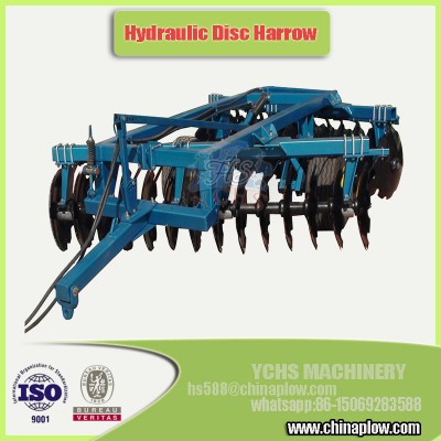 agricultural implements hydraulic disc harrow for YTO tractor Wheeled hydraulic disc harrow farm implementLCBB series of heavy duty disc harrow was designed according to the Europe standard .it adopts the features on hydraulic offset modular structure, built-bearing composite design, reasonable structure, bearing seal, long life, durable, easy to transport, easy to adjust, easy maintenance ..this heavy duty harrow also can be used to clean the stubble before tillage , break the hardened and impervious soil surface, crush and spread straw into the field, shatter soil after tillage, and level the land and preserve soil moisture. It can be used as tillage machine instead of plow on the cultivated land.Advantages:1)It is a trailed hydraulic offset disc harrow for 80-200hp tractor such as YTO,JOHNDEER tractor. 2)This hydraulic trailed heavy disk harrow is designed in the standard, of Europe.3)With high strength, good seal, the advantages of long life products.4)More strong harrow frame and to be in long working life.5)Unique design of bearing assembly can keep good seal.6)The disc blades are for 65Mn steel and the diameter of plough disc can be 710x8mm. SpecificationModel | Unit | LCBB-2024 | LCBB2428 | LCBB2834 |