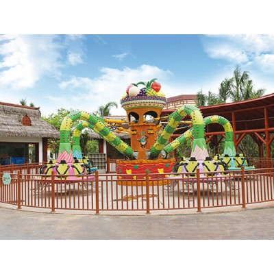 This magic big straw hat jumping ride has a modern octopus appearance and has five arms. When the jumping rides work, the main turntable makes revolution as well as the cabins with self-rotation by eccentric force. And the turntable can lift up during the process by hydro cylinder operation. The combination movements make passengers an exciting experience.