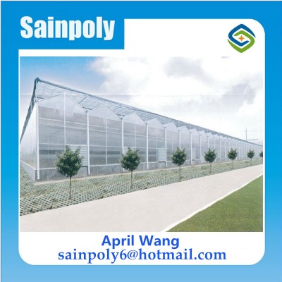 Polycarbonate (PC) Multi-span Greenhouse has the modern outline, stable structure and beautiful style, especially many roofs on every great span. It has the great performance to keep warm and transmit the sunlight. A lot of gutters can be equipped so as to drain the water on the roof. And the PC Greenhouse can resist the wind strongly. So that the PC Multi-span Greenhouse is suitable for the areas of heavy rains and strong winds. Moreover, the PC sheet is not very heavy and has great tensile strength.