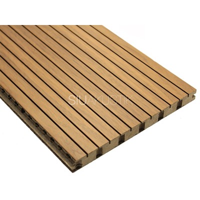 Siuakustik Type 14/2 acoustic wood panels have 2mm grooves in the front and have holes at the back. Probably the most popular among the grooves convinces with the fine groove of only 2 mm and the yet still good sound absorption performance. Type 14/2 can be used in all areas like Banks, Multi-purpose halls, Auditoriums, Offices, Meeting rooms, Theaters, Discos, Cinemas, Public buildings and so on.