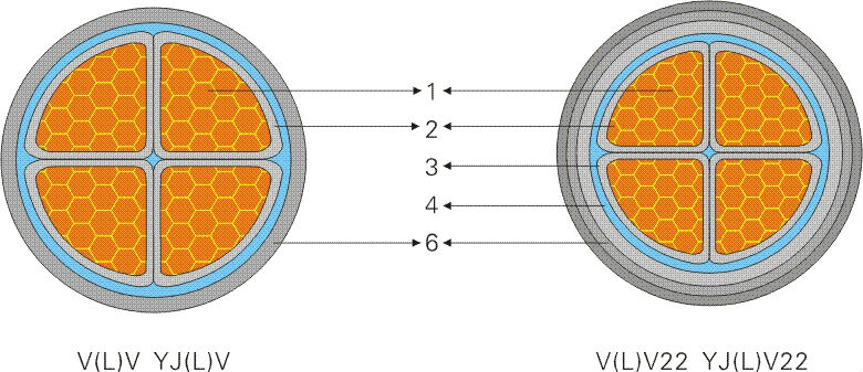 YJV22YJLV22Copper-core(aluminum core)XLPE insulation steel tape armoured PVC sheath power cableFor laying indoor,in tunnels and in ducts,can able to bear external mechanical forces